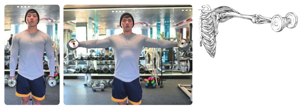 前臂并非必须伸直,可以略微弯曲,有些人习惯把动作做成“向两侧抬前臂”,这样做不仅效率低,还会增加肩关节的负荷。前臂主要负责承重,做动作时想着肘关节(肱骨)“先动”。
