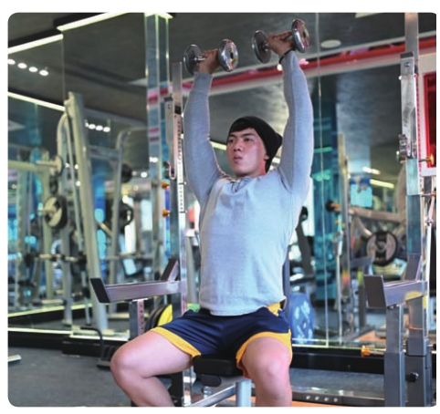 还有一种“旋转”的推法,在初始推举位置手背完全朝前,或者掌心相对,然后在上举的过程中逐渐旋转肘关节,在肘关节旋转和上臂上举的过程中,前臂依旧尽量和地面保持垂直。这种动作变化对肩膀稳定性要求最高,建议用轻重量练习,同时有肩袖损伤的人不适合做这个动作。