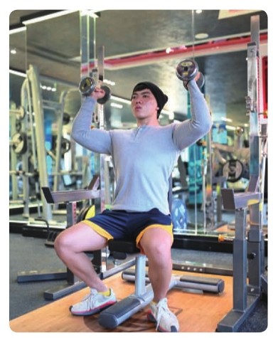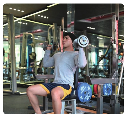 其次,做哑铃推举时,肘关节、腕关节更灵活,这就意味着可以用传统的正手握(掌心朝前)方式,也可以在动作起始位置锤握哑铃(中立握法、掌心相对),或者以最舒服的方式抓握哑铃。