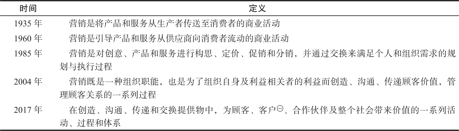 美国市场营销协会(American Marketing Association,AMA)是以“捕捉最新市场营销动态,发布最新市场营销研究成果”为宗旨,由致力于营销实践、教学与研究的人员组成的非营利性专业组织。在其近百年的发展历程中,AMA先后发布了5次营销定义,反映了不同时期营销实务的要求、营销观念的变化及营销理论的创新与突破,如表1-1所示。