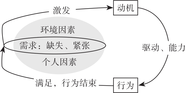 行为是顾客为满足需求而进行的活动或采取的措施,如寻求产品信息、比较价格、签订合同。需求是行为的根源,但有需求并不意味着一定会产生行为。心理学认为,当个体产生需求后,在环境、心理、能力等诸多因素影响下,会受动机驱动而采取具体行为,一旦行为使其需求满足,这就意味着内心缺失和紧张的状态得以消除,需求从产生到满足的过程也就结束了,如图1-9所示。