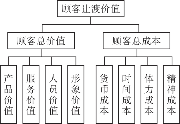 顾客让渡价值是顾客总价值与顾客总成本之间的差额,其构成如图1-11所示。顾客总价值就是顾客在产品购买与使用中所感知(或期望)的全部价值,包括产品价值、服务价值、人员价值与形象价值;顾客总成本则是顾客购买产品(预计)支付的货币成本、时间成本、体力成本与精神成本。显然,在购买决策中,顾客总是选择能够提供更高让渡价值的产品,这也意味着,产品或价格不是竞争的全部,服务、人员、形象、时间、体力、精神都是差异化的途径。