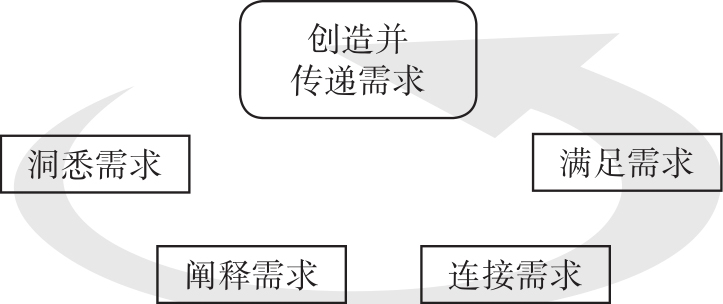 依据行为逻辑与阶段,营销者创造并传递需求的营销活动可分解为以下流程,如图1-10所示。 ①洞悉需求就是发现市场机会,营销者对外部环境变化与顾客需求及行为进行调查分析,洞悉未来市场的发展变化,识别顾客未被满足或有待开发的需求;②阐释需求是基于自身资源的有限性与竞争规避的考虑,聚焦目标市场,通过品牌、定位帮助顾客(目标市场)阐明、拓展需求背后的价值与意义;③连接需求要求营销者借助产品、价格、渠道、传播等方面连接顾客,传递价值,使更多顾客认识、接受这种需求及产品;④满足需求则是营销者要构建销售组织、销售流程,落地营销与销售方案,使顾客购买、使用产品并形成长期、稳定的顾客关系。