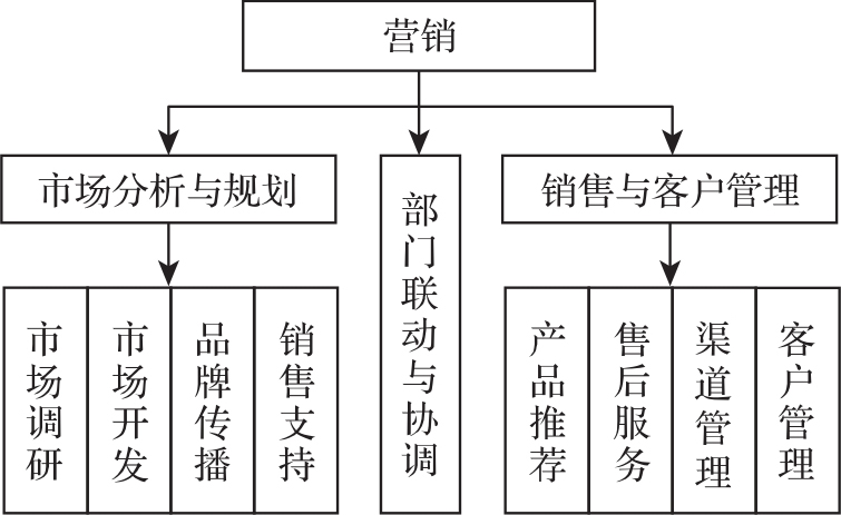 市场分析与规划是面向潜在及目标顾客的整体活动,重在唤醒顾客的潜在需求,激发新需求,拉动消费者对产品的搜寻和购买;部门联动与协调负责保障分属不同部门、团队的营销资源(人、财、物、信息等)及活动的高效整合与合作;销售与客户管理则更多是面向具体顾客(包括中间商)的单一活动,通过具体活动的执行与服务提供,一对一地帮助顾客满足需求或解决购后使用问题。营销职能间的相互关系如图1-5所示。