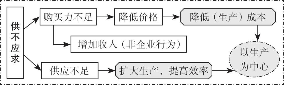 20世纪20年代以前,企业生产技术相对落后,生产效率不高,产品供不应求,即使存在产品滞销情况,也多是因为顾客购买力不足造成的产品相对过剩,而非需求饱和下的绝对过剩。因此,以生产为中心,以合适价格扩大产品供应是当时企业经营的重点,企业致力于生产效率、产能的提升及生产成本的降低,生产观也由此产生,具体如图1-6所示。