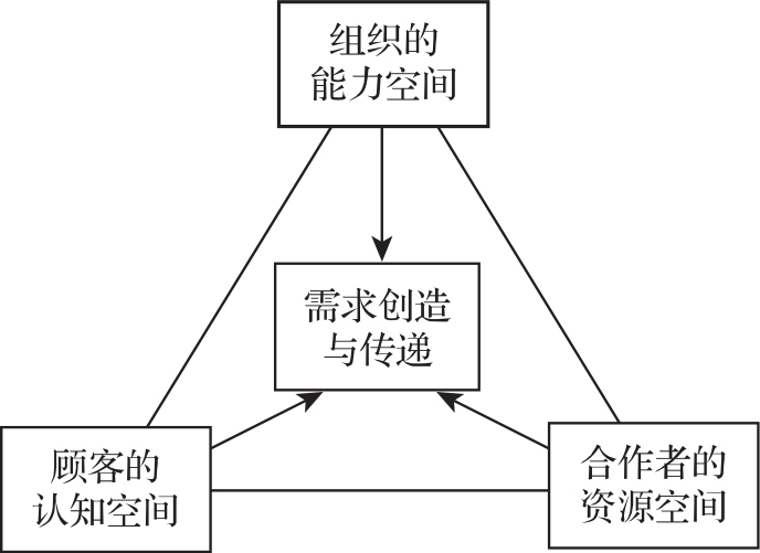 顾客需求的产生是一个复杂的过程,受多种因素影响,因而需求创造与传递是一项系统工程,受制于组织的能力空间、顾客的认知空间及合作者的资源空间的影响,具体如图1-3所示。