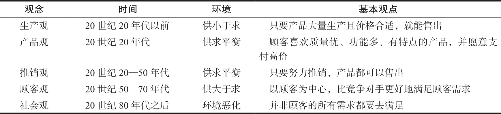 用于指导组织营销活动及管理的态度、思想及理念统称为营销观念。同营销定义一样,营销观念也是动态发展的,随着生产力的提高与供求关系的变化,分为传统营销观与现代营销观两大类,前者包括生产观、产品观与推销观,后者包括顾客观与社会观,如表1-2所示。