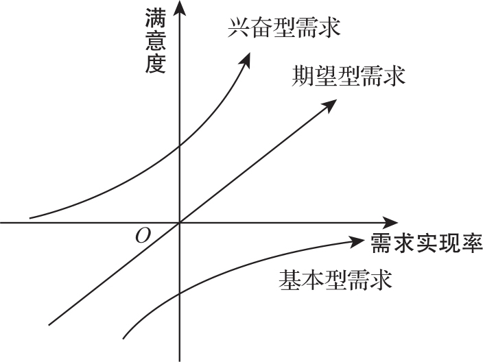 日本学者狩野纪昭(Noriaki Kano)根据企业所提供的产品对顾客需求的满足程度,提出KANO模型,将顾客需求从结构上分为基本型需求、期望型需求和兴奋型需求,如图3-4所示。