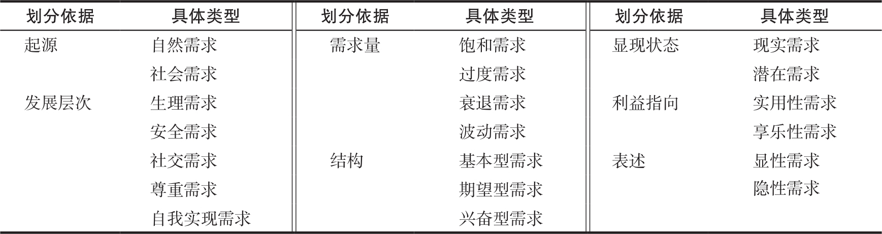 2.按照起源,需求可以分为自然需求与社会需求;按照发展层次,可以分为生理需求、安全需求、社交需求、尊重需求与自我实现需求;按照需求量,可以分为饱和需求、过度需求、衰退需求、波动需求;按照显现状态,可以分为现实需求与潜在需求;按照利益指向,可以分为实用性需求与享乐性需求;按照结构,可以分为基本型需求、期望型需求与兴奋型需求;按照表述,可以分为显性需求与隐性需求。