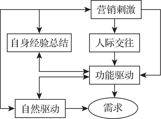 概括起来,导致个体需求产生的内外部刺激包括自然驱动、功能驱动、自身经验总结、人际交往和营销刺激等5个方面,如图3-2所示。自然驱动和功能驱动是最基本的需求产生力量,其他驱动因素都要通过它们才能发挥作用。