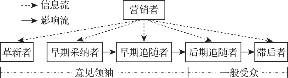 需求扩散的过程包括信息流与影响流两个环节,信息流呈现信息传递的过程,影响流则体现效果形成及发散过程,如图3-5所示。 营销者利用电视、互联网等媒介直接面向各类受众传递信息(即信息流),信息虽然可以直接到达受众,但信息的影响需要经过人际传播的多重中介过滤(即影响流),形成多级传播才能最终影响一般受众。这也意味着,在需求扩散的过程中存在影响其他群体或群体其他成员的中间角色,即意见领袖,意见领袖及其影响力的存在促进了需求扩散的速度与范围。