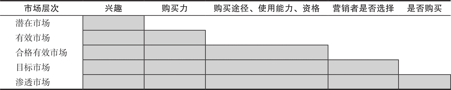 11.根据顾客购买状态,市场可以划分为潜在市场、有效市场、合格有效市场、目标市场、渗透市场5个层次。营销者在进行需求量测算时,必须明确测算的是哪个层次的市场。