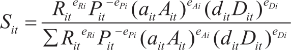 式中 S it —— i 企业在 t 年预计的市场份额;