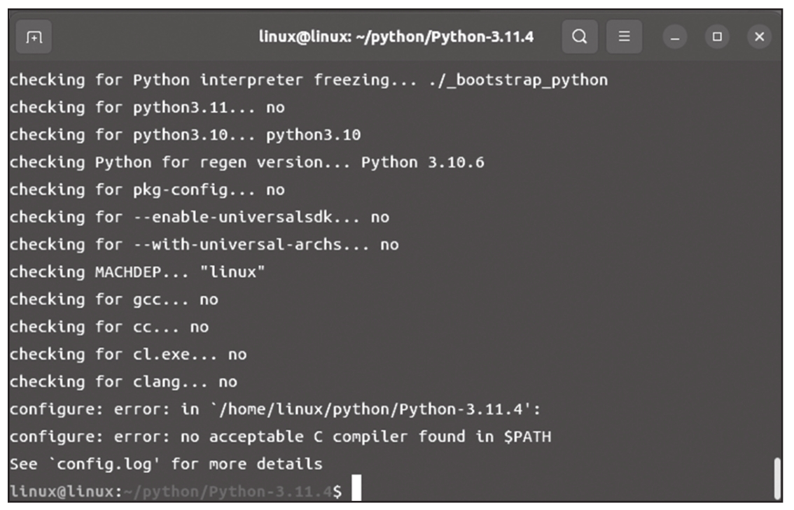 步骤3 执行“./configure--prefix=/usr/python”命令,将Python 3.11.4的安装目录配置为/usr/python,如图1-11c所示。