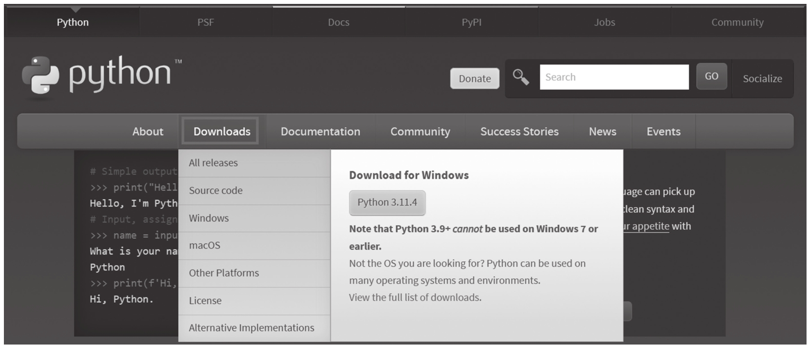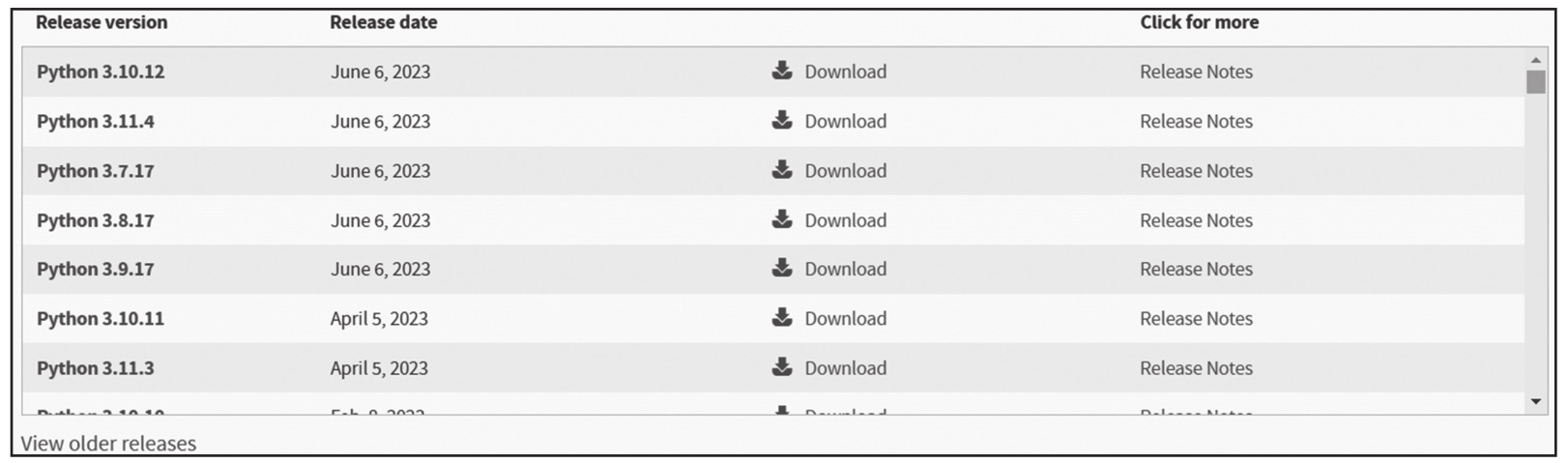 在Linux、Windows、Macintosh、Android等平台上,都可以安装Python语言环境以支持Python程序的运行,这里仅介绍Windows和Linux两种平台上的Python语言环境安装方法。本书所使用的Python版本为2023年6月6日发布的3.11.4,读者可从Python官网(https://www.python.org)的Downloads页面下载各平台的安装包,如图1-4所示。