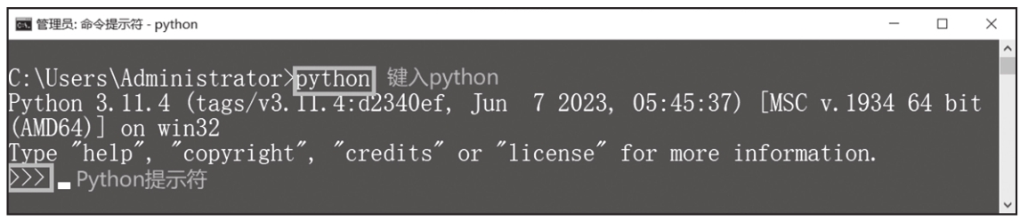 安装Python 3.11.4后,用鼠标左键单击任务栏最左侧的开始图标 ,搜索“命令提示符”并打开,在命令提示符下键入“python”,可进入Python控制台,Python提示符为“>>>”,如图1-10所示。