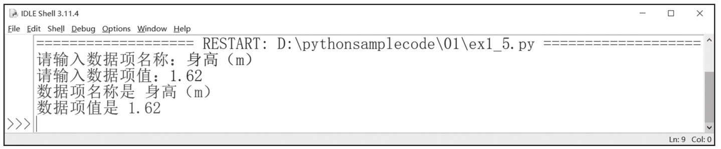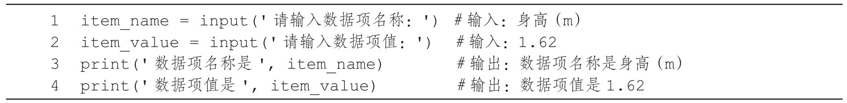 一条数据通常由多个数据项组成,如用于生活习惯与BMI关联分析的一条数据中会包括身高、体重、性别、每日吃饭次数、每日饮水量等数据项。本章仅学习了Python编程的一些基础知识,因此这里只介绍如何应用本章所学习的知识进行数据项名称和数据项值的录入与查看操作,如代码清单1-5所示。