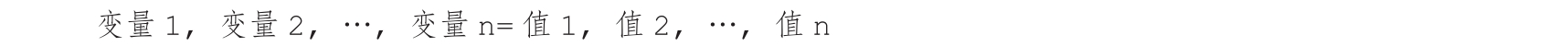 赋值运算符右边的值1、值2、…、值n会分别赋给左边的变量1、变量2、…、变量n。