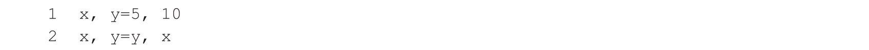 提示 对于赋值运算,先计算赋值运算符右边的表达式的值,再将计算结果赋给左边的变量。因此,第2行代码先得到赋值运算符右侧的y和x的值,再将它们分别赋给左边的变量。取出右侧的y和x的值后,第2行代码转换为x, y=10, 5,然后再执行赋值运算,即将10赋给x,将5赋给y。