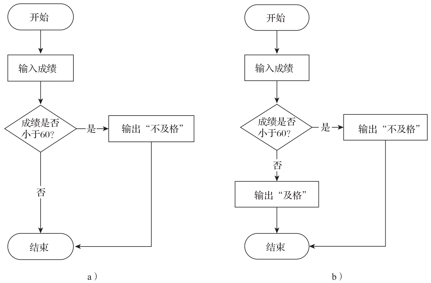 通过设置条件,可以使得某些语句在条件满足时才会执行。例如,如果一名学生某门课程的成绩小于60分,则输出“不及格”,否则不输出任何信息,那么可以按照图2-37a所示流程编写程序。当然,在实际使用中,我们希望能给及格的学生也反馈一些信息,所以可以按照图2-37b所示流程编写程序:当一名学生某门课程的成绩小于60分时,则输出“不及格”,否则输出“及格”。