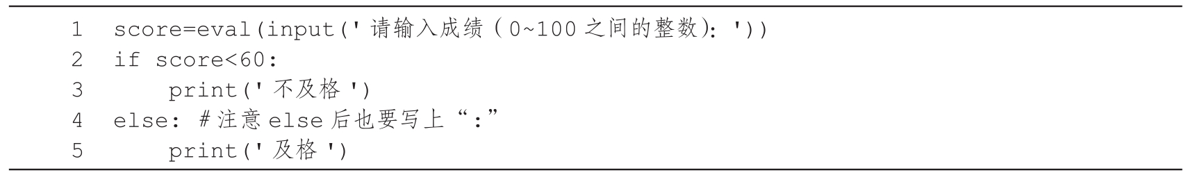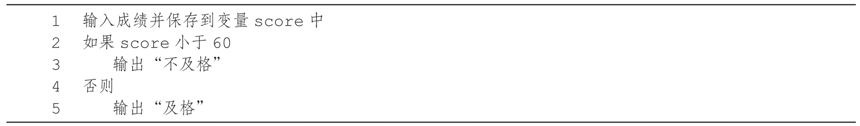 3.代码清单2-23的第4行代码“否则,如果score小于70”中,虽然没有写“score大于或等于60”,但因为第2行代码“如果score小于60”不成立,才执行第4行代码的判断,所以在执行第4行代码时score必然是大于或等于60的。第6、8、10行代码的判断也类似。在编写程序时,应尽量减少冗余的判断,以尽可能提高程序执行效率。