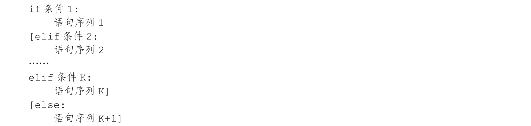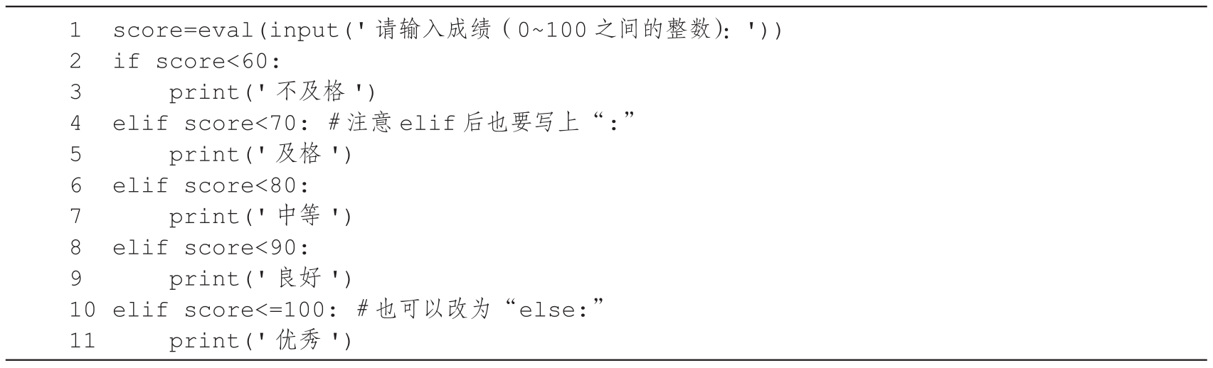 其中,if表示“如果”,elif表示“否则如果”,else表示“否则”。最简单的条件语句只有if,elif和else都是可选项,根据需要决定是否使用。