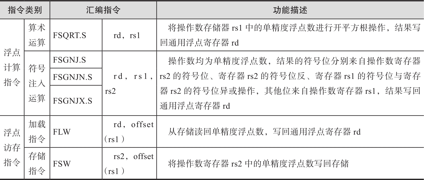 F扩展中定义了浮点计算指令和浮点访存指令。浮点计算指令分为数据分类、转移、转换、比较、算术、符号注入指令,浮点数据访存指令包括用于存储器和浮点寄存器堆之间访存数据的FLW、FSW指令。浮点计算指令是在浮点通用寄存器和整数通用寄存器的操作数之间进行的,所以浮点计算指令使用R指令格式。在RV32F指令集中,各指令的汇编格式以及功能描述如表2-6所示。