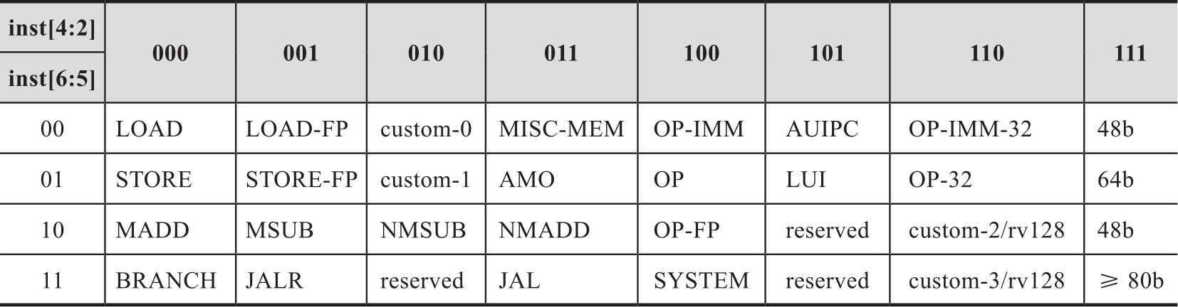 指令格式中低7位是主操作码opcode,opcode最低两位为11表示该指令的位宽大于16,低两位为00、01、10表示该指令是16位宽的压缩指令,主操作码使用情况如表2-3所示。opcode第三位到第五位为1时,表示指令编码的长度大于32。标识为“reserved”的主操作码应该避免留给自定义扩展使用,它是留给未来的指令集标准扩展使用的;标识为“custom-0”或“custom-1”的主操作码留给指令长度是32的指令集自定义扩展使用;标识为“custom-2/rv128”或“custom-3/rv128”的主操作码留给RV128的自定义扩展使用,它也可以留给RV32或RV64的指令集自定义扩展使用。