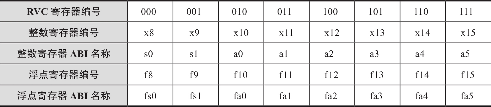 接下来介绍C扩展的压缩指令格式,表2-7给出了9种压缩指令格式。CR、CI和CSS可以使用32个RVI寄存器中的任何一个,但CIW、CL、CS、CA和CB只能使用其中的8个,如表2-8所示。注意,有一个单独版本的加载和存储指令,使用堆栈指针作为基本地址寄存器,因为从堆栈中保存和恢复是普遍的,并且它们使用CI和CSS格式允许访问所有32个数据寄存器。CIW为ADDI4SPN指令提供了一个8位的立即数指令。浮点访存的压缩指令使用CL和CS格式,将8个寄存器映射到f8~f15。