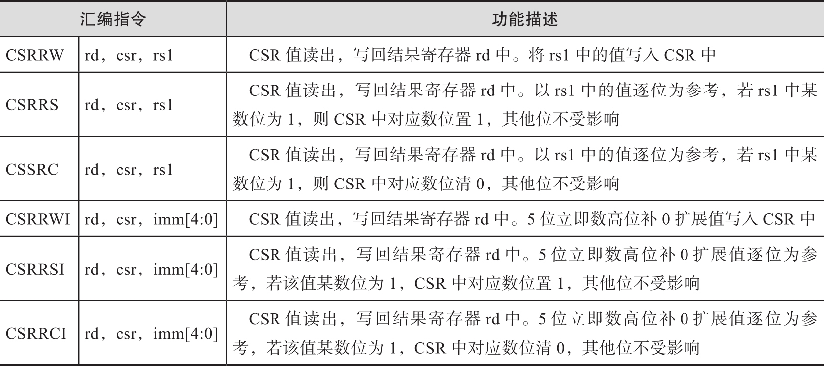 Zicsr扩展总共存在6条CSR操作指令,如表2-10所示。