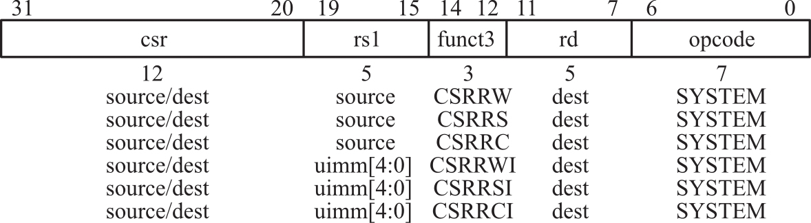 首先介绍CSR指令,所有的CSR指令都是原子化地读或写一个CSR,如图2-2所示,其CSR指示符编码在指令的12位csr字段中,位数为20~31。立即数形式使用rs1字段中编码的5位零扩展立即数。