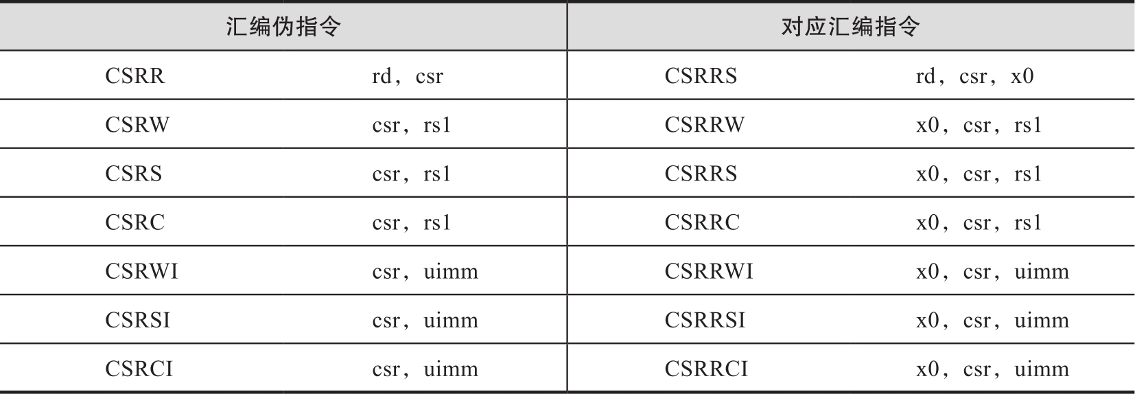 前文所述的指令存在相应的伪指令。读取CSR的汇编器伪指令CSRR rd,csr;写回CSR的汇编程序伪指令CSRW csr,rs1,CSRWI csr,uimm。进一步定义汇编器伪指令,利用CSRS / CSRC csr,rs1或者CSRSI / CSRCI csr,uimm指令设置并清除CSR的某些数位。汇编伪指令对应的汇编指令如表2-11所示。