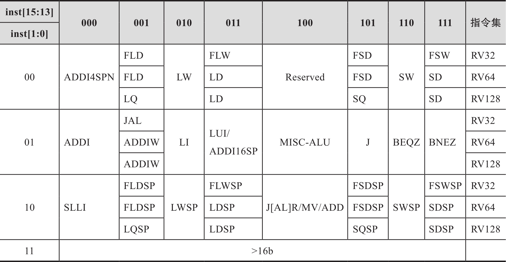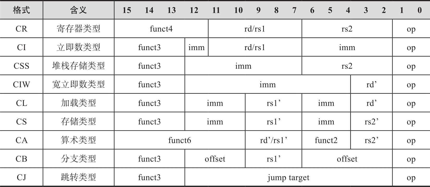表2-7 16位RVC压缩指令组成格式