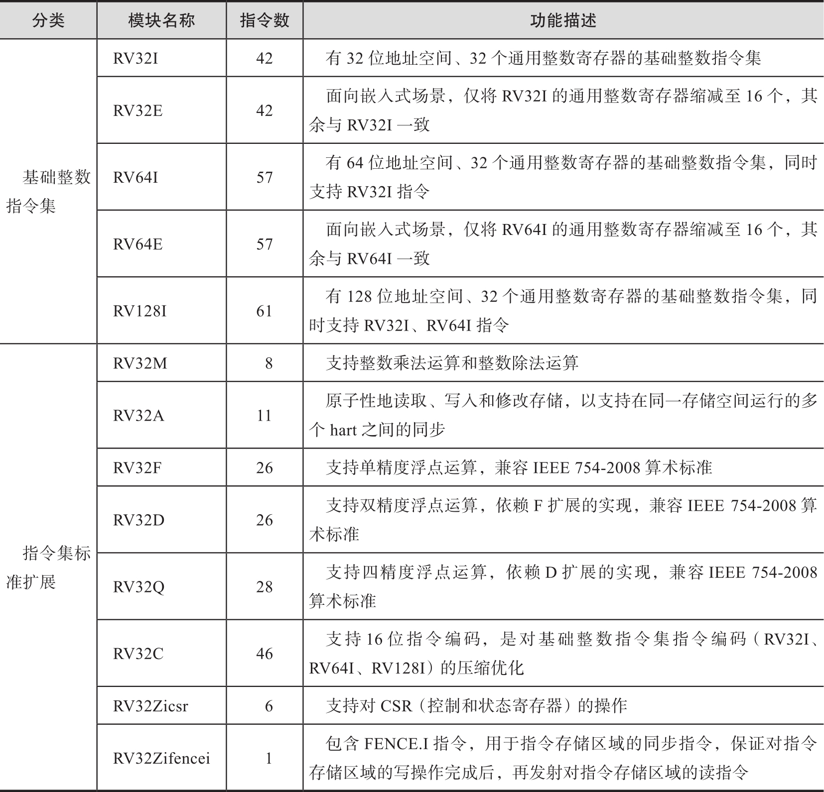 为了能够广泛应用在嵌入式、个人计算机、服务器等各种成本和性能的应用场景中,RISC-V指令集采用模块化的架构设计,包括基础整数指令集和指令集标准扩展等两大类。基础整数指令集是所有处理器都必须实现的核心部分,它仅有40余条指令,十分简洁,但是足以支持操作系统等软件的运行,并且能够满足教育科研、嵌入式处理器和通用处理器的指令集需求。针对嵌入式处理器、通用处理器等不同低、中、高端的应用场景,RISC-V的基础整数指令集分为RV32I、RV32E、RV64I、RV64E、RV128I这五种类型,它们在处理器位宽和寄存器数量等方面有所不同。