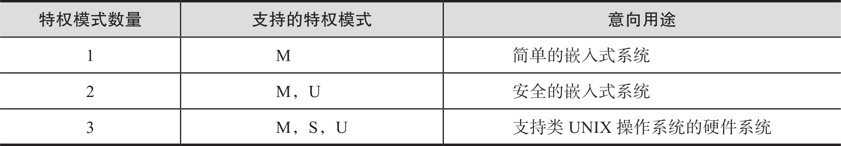 RISC-V的特权架构设计旨在实现对系统资源的有效保护和访问控制,同时为操作系统和应用程序提供一种可扩展、灵活的硬件支持。在特权架构实现中,机器模式为必选特权模式,许多嵌入式系统只需要实现机器模式便可以满足需要,另外两种为可选特权模式。通过不同的特权模式组合可以实现不同用途的硬件系统,如表2-12所示。