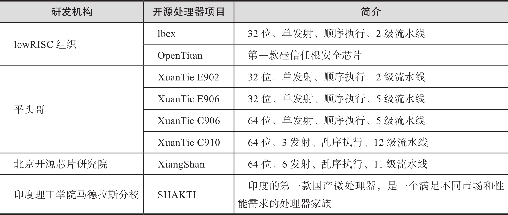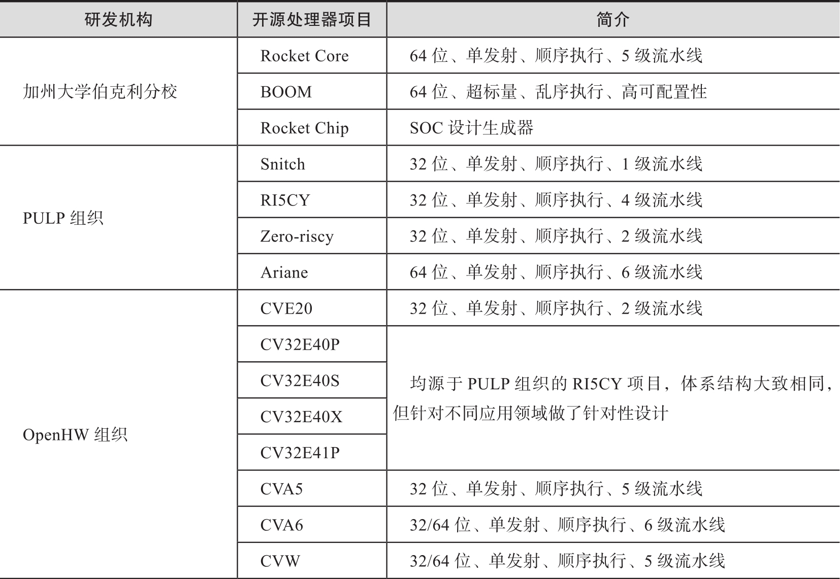 表2-13 RISC-V开源处理器项目简介