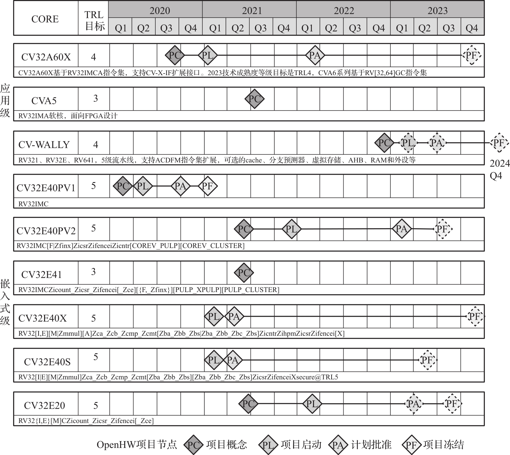 OpenHW是由其成员和个人贡献者组成的非营利性的全球开源硬件组织,硬件工程师和软件工程师参与该组织协作开发开源处理器内核及相关的IP、工具和软件等,OpenHW组织提供了行业最佳的高质量开源硬件开发的基础设施。CORE-V系列RISC-V开源处理器内核是OpenHW组织开发和维护的主要开源处理器项目,包括应用级和嵌入式级两类,CORE-V系列的目标是提供符合行业标准的内核IP,以促进设计的快速创新和推动SOC设计开发,CORE-V系列处理器内核的开发路线图如图2-3所示。