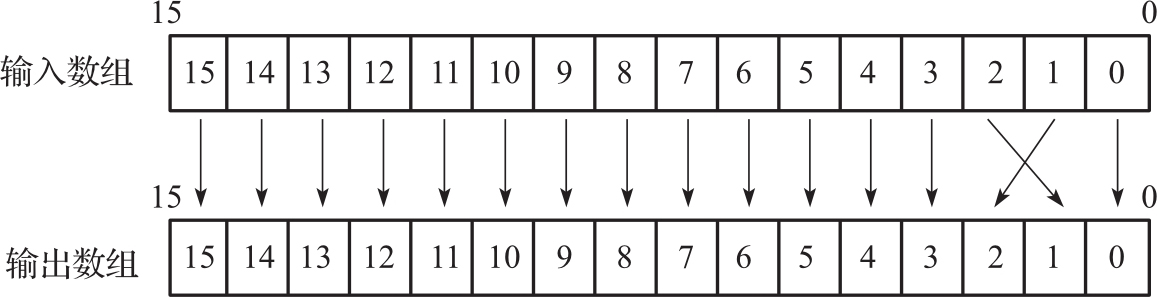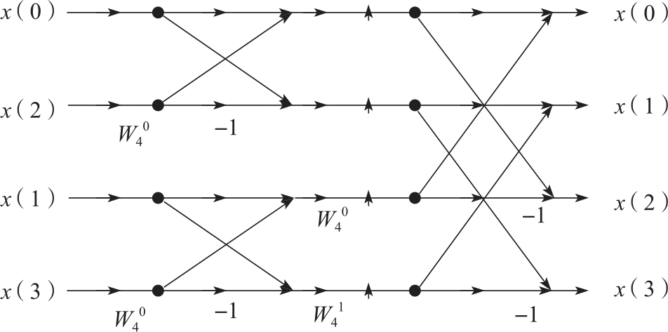 位反寻址(bit-reverse addressing mode)是支持高效实现快速傅里叶变换(Fast Fourier Transformation,FFT)算法的特殊寻址方式。给定数组中特定元素的地址,DSP自动计算位反序中下一个元素的地址。FFT算法在进行离散傅里叶变换的蝶形运算开始或结束时需要隐式地将正在处理的数据数组重排,以便最终获得按顺序排列的数据。位反重新排序可以通过将数据字从顺序寻址数组复制到位反序数组来执行,位反寻址可以通过地址规避数据复制带来的开销,达到更高效的处理实现。以4点基2-FFT为例,图1-6为蝶形运算示意图,而图1-7示意了为更高效地进行蝶形运算,在输入处采用位反寻址做数据重排。