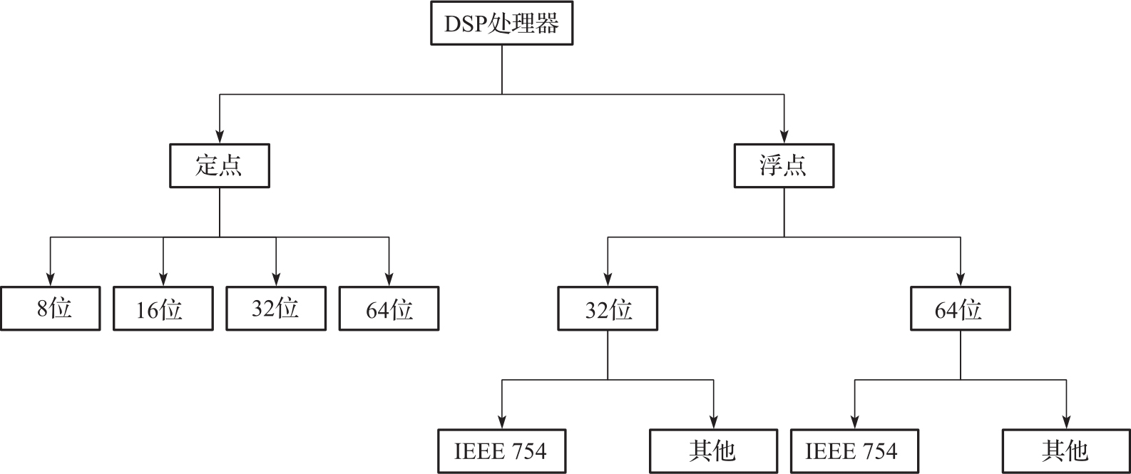 DSP处理的数据类型一般分为定点数据格式表示和浮点数据格式表示两类。DSP中常用的数据格式表示如图1-2所示。定点多采用8位、16位、32位和64位。浮点一般符合IEEE 754标准,主要为32位单精度浮点计算和64位双精度浮点运算。