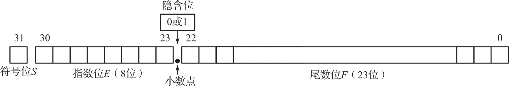 浮点DSP处理器支持浮点数据格式,由符号位 S 、指数位 E 、尾数位 F 组成。IEEE 754标准32位浮点表示如图1-4所示,符号位 S 、指数位 E 、尾数位 F 的长度分别为1位、8位、23位,并包含一位隐含位。单精度浮点格式与数值对应关系分为非规格化数和规格化数两种情况,隐含位分别为0和1。非规格化数遵循公式Denormal=(-l) S ×(0. F )×2 1-BIAS ,规格化数遵循公式Normal=(-l) S ×(1. F )×2 E -BIAS ,其中单精度浮点格式的偏置值BIAS为127。指数位为无符号的二进制整数表示,尾数位为无符号的小数表示,根据数据换算公式即可转换为十进制数据。