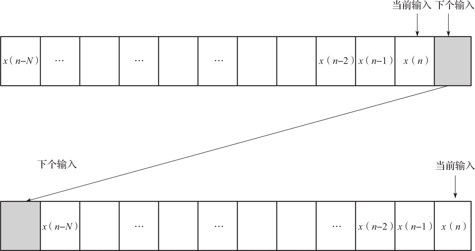FIR新数据写在前一个样本的下一个位置,如果采用线性寻址方式,长度为 N 的FIR数据序列就会一直往高地址方向移动,通常情况下数据空间有限,不具备移动的条件。而采用循环缓存,则通过移动指针而不是移动数据本身来实现,指针能够从最后一个位置跳回到第一个位置。通过这种方式,FIR数据看起来是连续的,最新的数据覆盖最旧的数据。图1-5为循环缓存示意图。