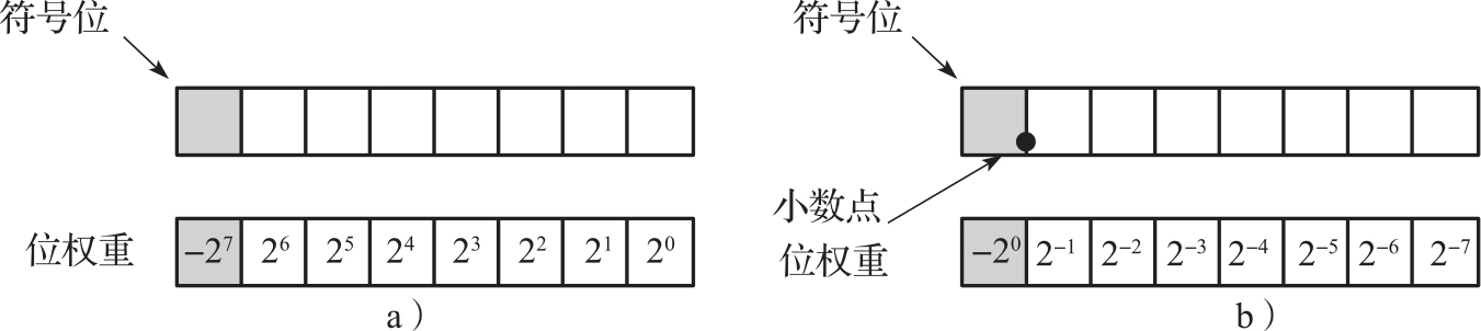 图1-3 8位有符号二进制整数表示a);8位有符号二进制小数表示b)