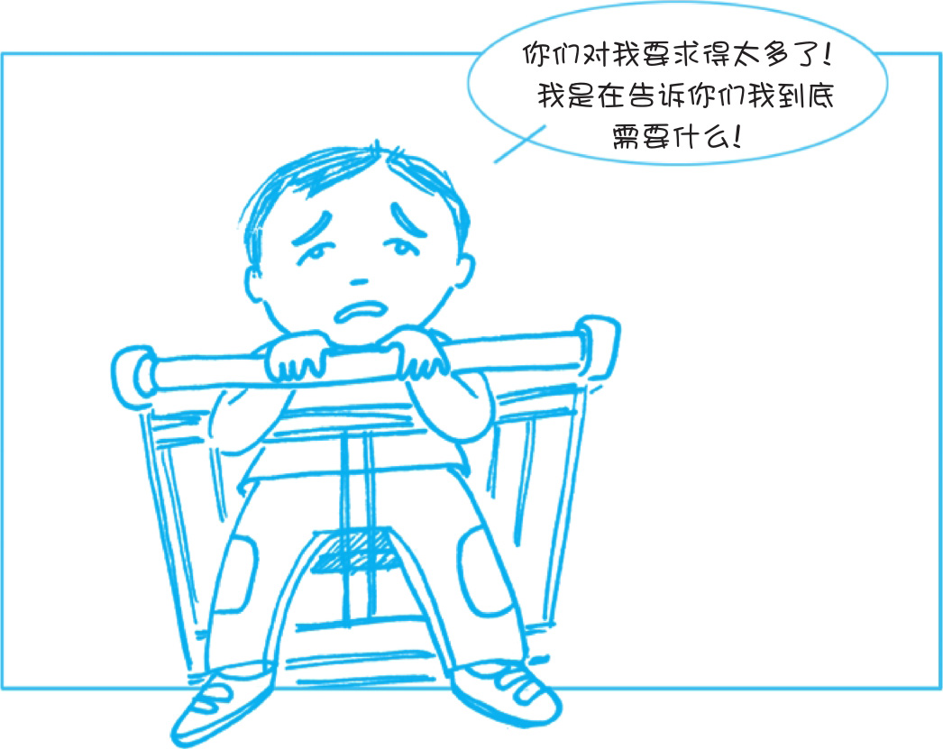 首先,我试图给这位父亲解释:他的孩子有时不能调整好自己,不是因为他自己选择做个固执顽劣的孩子。这时,这位父亲用身体语言很清楚地表达了他对我这番解释的态度:他交叉着双臂,将背脊靠在椅子上。虽然他没有真的翻白眼,但是很明显,他不吃我这一套。于是我直说道:“我感觉你并不同意我这个说法。”
