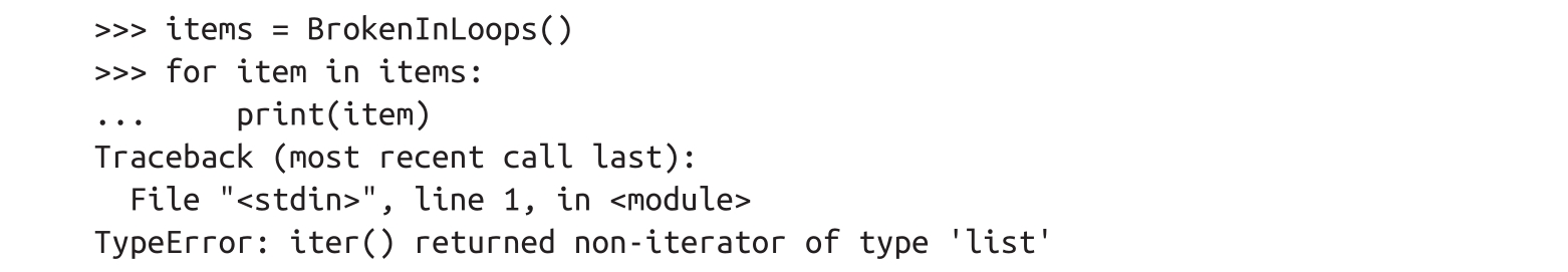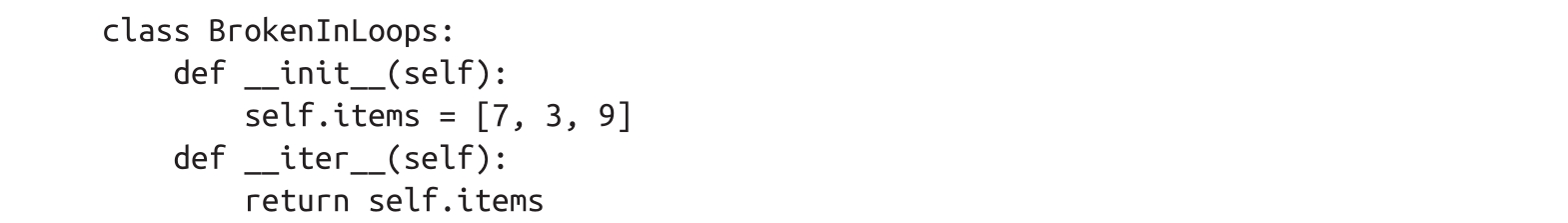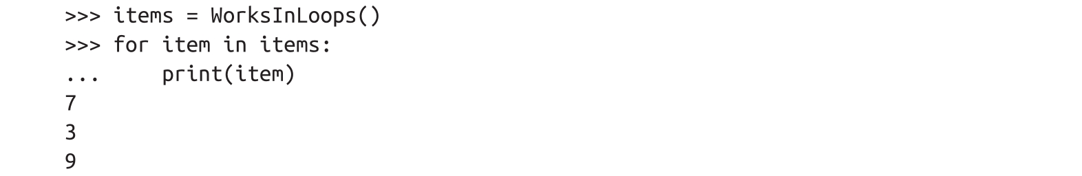 这样,类WorksInLoops就成了可迭代对象,因为__iter__()方法返回的是真正的迭代器对象,可确保WorksInLoops遵循迭代器协议。每次调用该__iter__()方法,都会生成新的迭代器: