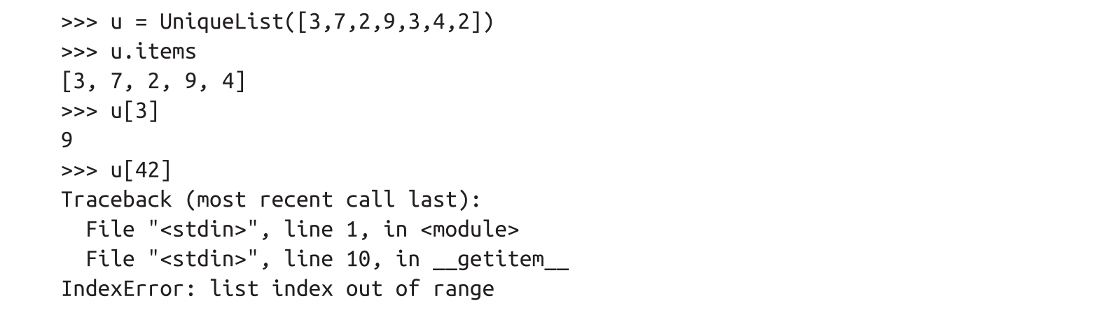 注意,实现很简单是因为代码内部使用了列表(负责处理__getitem__逻辑)。当创建类似列表的自定义集合,或其他标准集合类型时,这是一个编码技巧。如果对象内部以标准数据类型存储数据,则模仿其行为通常会更容易一些。