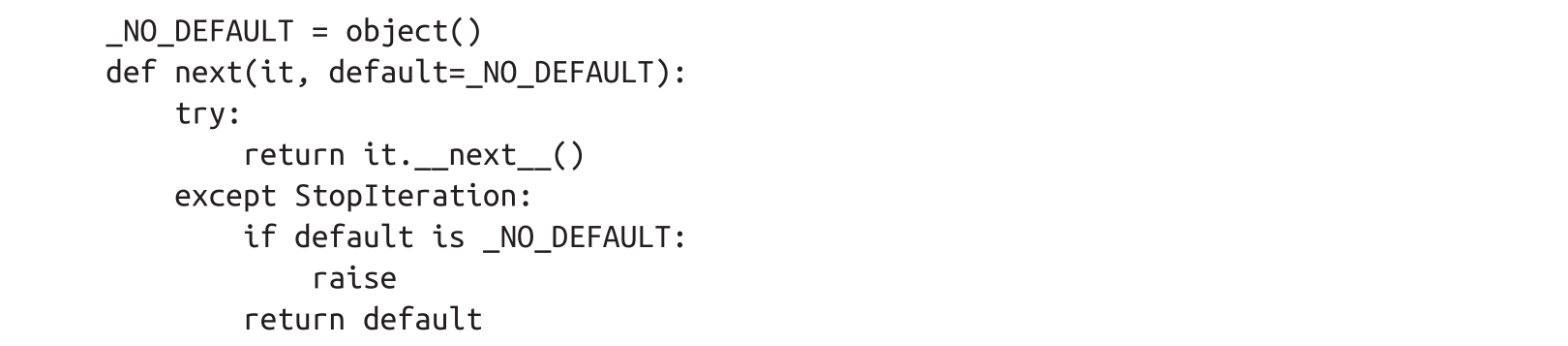 (注意,此函数创建了专用的哨兵值_NO_DEFAULT,而不是使用像None这样的内置值。哨兵值主要用于算法中的信号传递,不会与真实数据的任何值冲突。这样,向default传递任何值也不会发生冲突。)