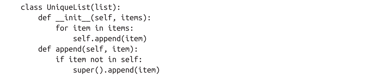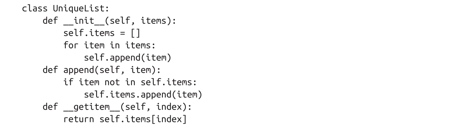 当实现容器类型时,你可能希望让该容器可迭代,以用于for循环。根据容器的性质,通常最容易实现的是可迭代协议。作为示例,考虑UniqueList类型,这是一种介于列表和集合的混合类型: