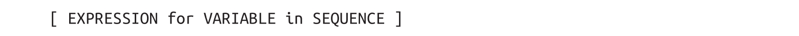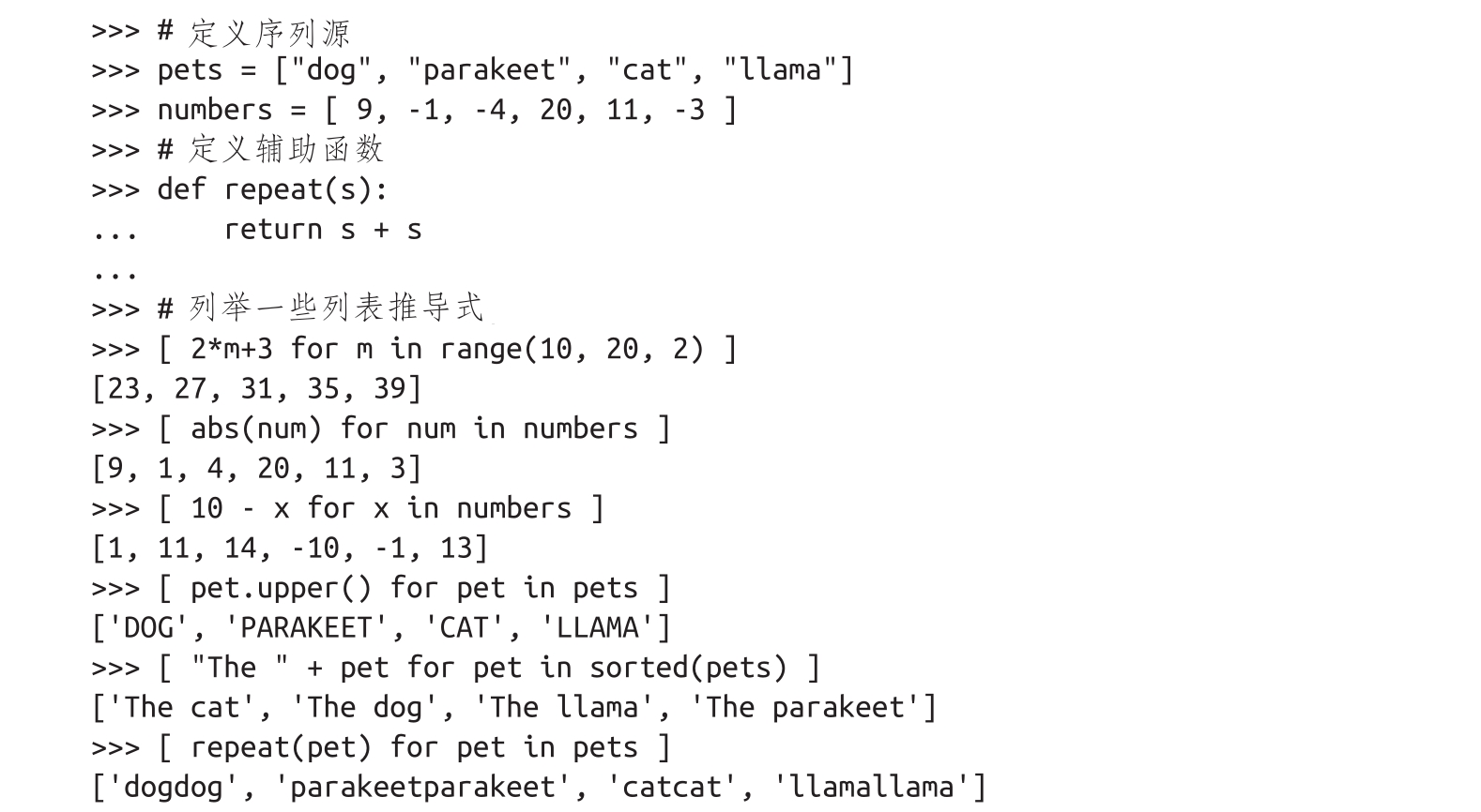 注意,以上列表推导式都符合同样的结构。它们都使用了关键字for和in,二者是Python推导式所必需的。关键字for和in出现在三个字段之间,即表达式、变量(构成表达式的标识符)和序列源。