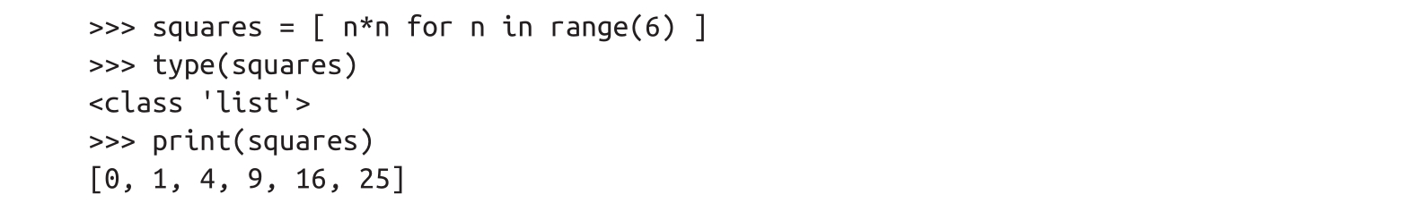 注意,结果是一个普通列表。在squares中,表达式为n*n,变量为n,序列源是range(6)。序列是range对象,也可以是任何可迭代对象,比如列表或元组、生成器对象或其他类型。