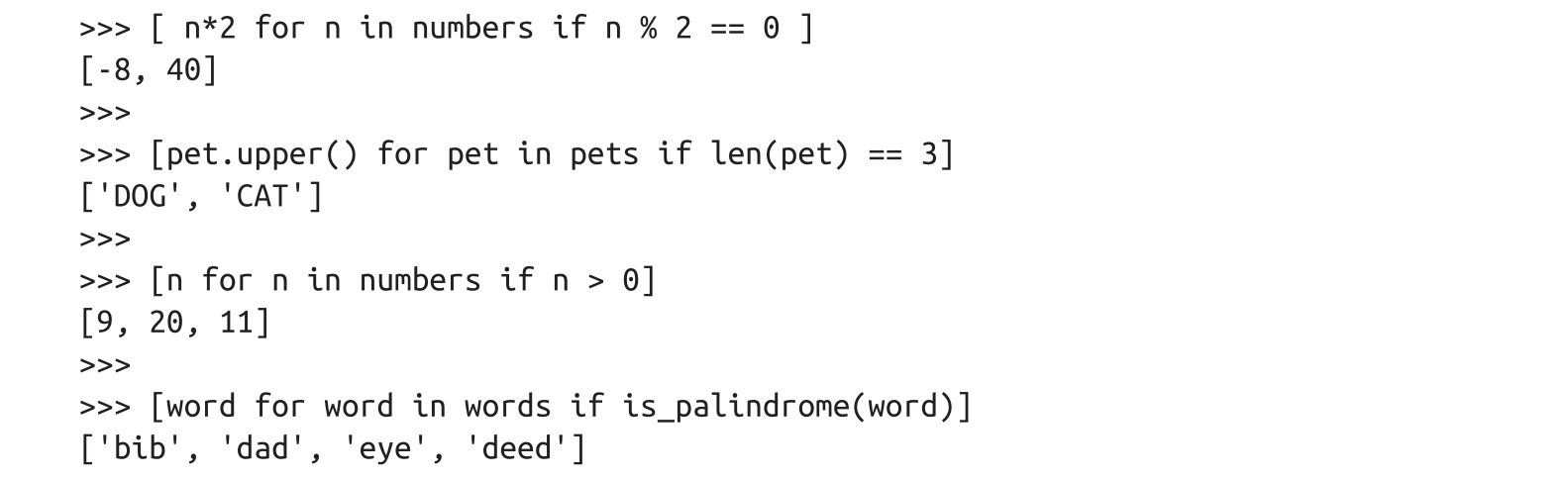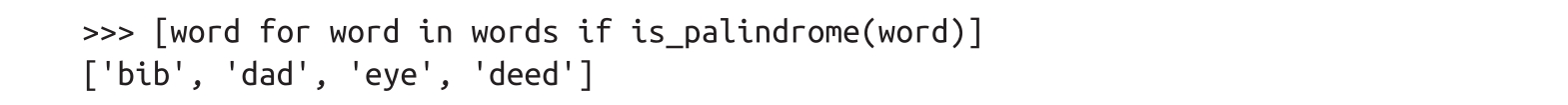 。注意,条件可以是应用于变量的函数(如is_palindrome(word)),或是更复杂的表达式。使用函数可以提高可读性,并且支持复杂的过滤逻辑,逻辑代码可能无法用单行完成。